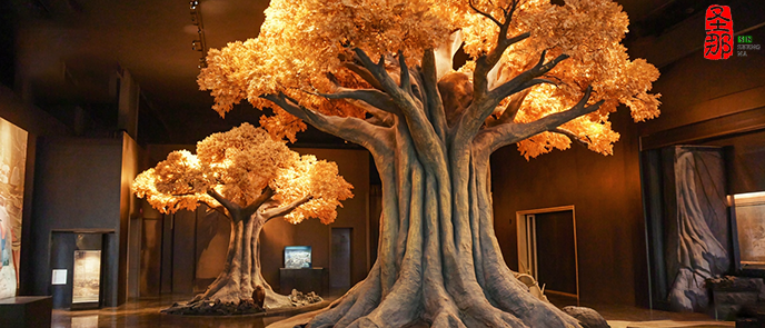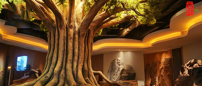 把柱子变成仿真树又一力作,为呼和浩特万达广场奥菲力连锁店制作的包柱子仿真树,高度3.6米、树干直径1.3米、树冠6米,造价1.6万元。