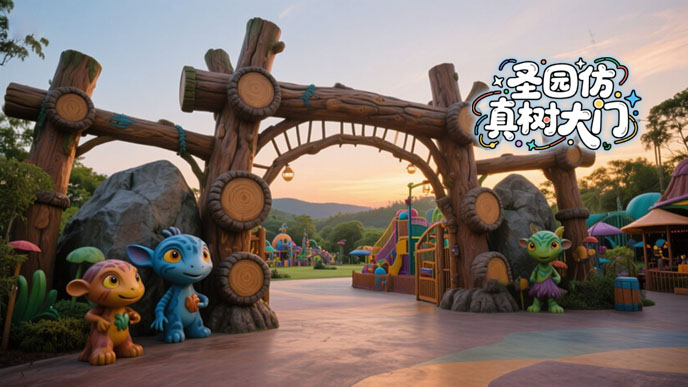 对比来看,设计图虽保留了 “古木” 的意境,但更偏重于视觉美感;修改后的仿真树大门实景则在安全与实用上实现了平衡 —— 加粗的树根让大门更显稳固,主要展现树干骨架美解决了户外仿真树叶维护难题,调整后的灯光既保留了氛围感,又避免了视觉杂乱。这种从 “理想设计” 到 “实景优化” 的转变,让仿真树大门既守住了设计初心,又更贴合园区的实际使用需求。