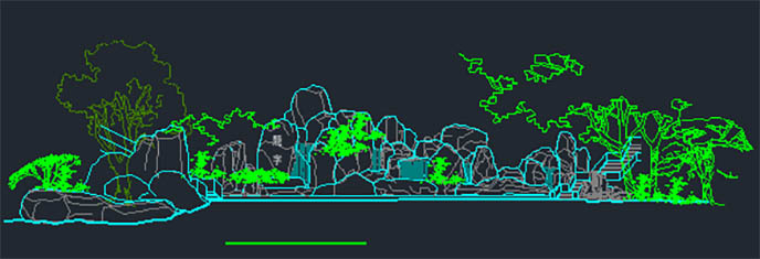 终的仿真假山施工图-正面效果图如下,仿真假山和后面的土山相结合,仿真假山变成高低两部分,中间是经过详细设计的步道,步道有拱桥做装饰。