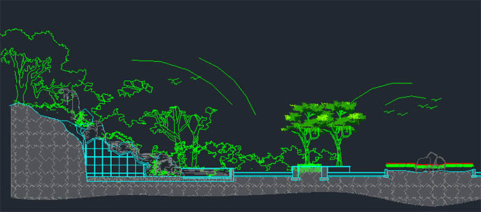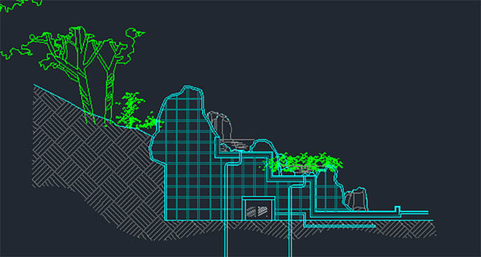 版的仿真假山施工图只有仿真假山及水系,没有考虑制作溶洞、及在溶洞内修建道路,由于背后的土山有相对大的高差,所以在制作第二版仿真假山施工图时考虑到把仿真假山当作护坡使用。