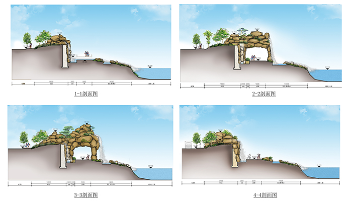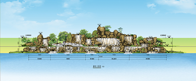 修改后的仿真假山施工图的终效果图如下,把瀑布、溶洞、步道融和到一起。
