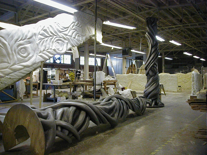 项目描述:制作中的玻璃钢舞台道具树,张图片是从模具中制作完成的玻璃钢舞台道具树半成品组装后的情况,这时的舞台道具树还是半成品,表面没有经过打磨,树干及边缘还有很多毛刺,需要进行修整打磨处理。