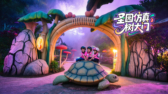 对比来看,设计图虽保留了 “古木” 的意境,但更偏重于视觉美感;修改后的仿真树大门实景则在安全与实用上实现了平衡 —— 加粗的树根让大门更显稳固,主要展现树干骨架美解决了户外仿真树叶维护难题,调整后的灯光既保留了氛围感,又避免了视觉杂乱。这种从 “理想设计” 到 “实景优化” 的转变,让仿真树大门既守住了设计初心,又更贴合园区的实际使用需求。
