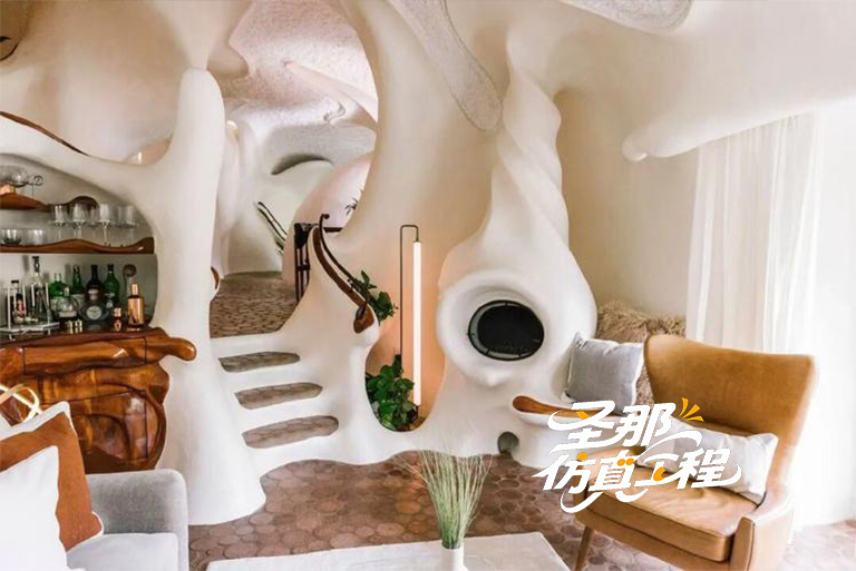作为全屋具视觉冲击力的设计,仿真树设计师用另一个瘦高的仿真树来拉展房间明亮和高挑的位置。这个竖向的仿真树进一步拉伸了空间的纵深感,让人感受到一种视觉上的延伸。再往前走,便到达了作为空间枢纽般的“中央小广场”。
